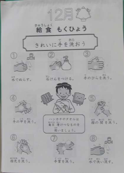 12月の給食目標は、「きれいに手を洗おう」です。風邪やインフルエンザがはやる時期です。毎日、忘れずにハンカチ、ティッシュを持ってきましょう。