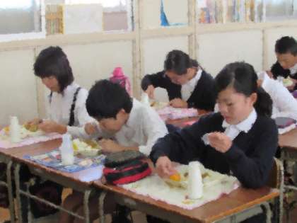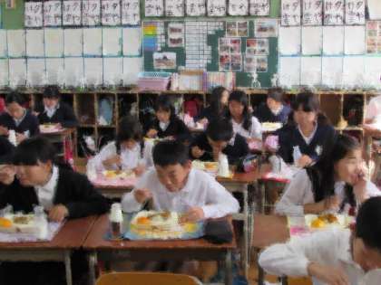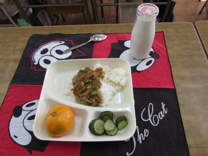 本日の給食の献立をご紹介します。今日の給食は、ドライカレー、きゅうりのサラダ、みかん、牛乳でした。