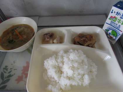 本日の献立は、ご飯、牛乳、鶏肉の甘辛焼き、田辺大根葉の味噌汁、田辺大根の煮物でした。