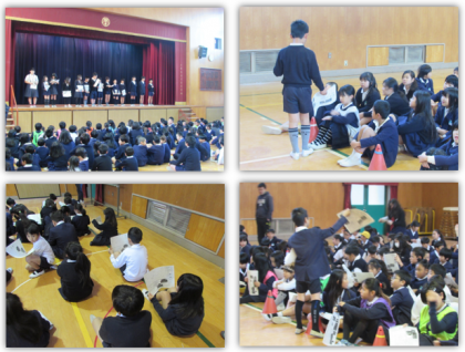 本日の集会は、新聞・掲示委員会による発表でした。運動会号の新聞が配られ、皆で読んでいます。