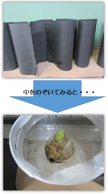 2年生の教室の後ろに、黒い画用紙を丸めたものが並べられています。中をのぞくと、そこにはヒヤシンスの水栽培が。根が伸び、芽が出てるものが多くなってきました。