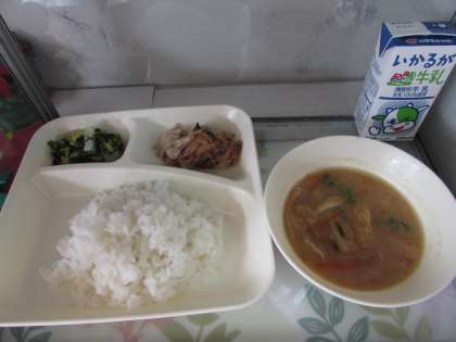 本日の献立は、ご飯、牛乳、豚肉のしょうが焼き、さつまいものみそ汁、菊菜と白菜のごま和えでした。