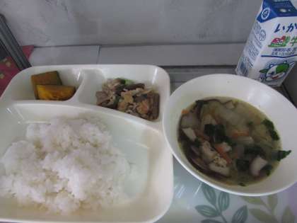 本日の献立は、ご飯、牛乳、豚肉と干しずいきの味噌煮、すまし汁、焼きかぼちゃでした。