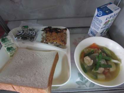 本日の献立は、食パン、マーガリン、牛乳、鶏肉とじゃがいものスープ煮、きのこのドリア、ミニフィッシュでした。