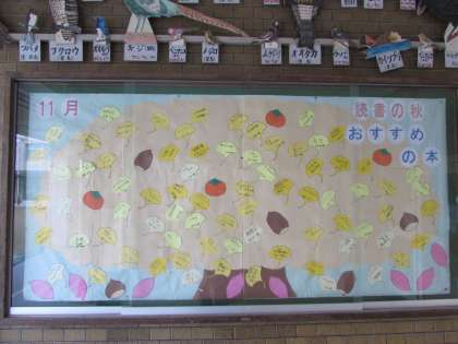 11月になり、玄関掲示が変わりました。11月の玄関掲示は、5年生の作品です。5年生の子どもたちが、おすすめの本を書いています。学校にお越しの際に、ぜひ、ご覧下さい。