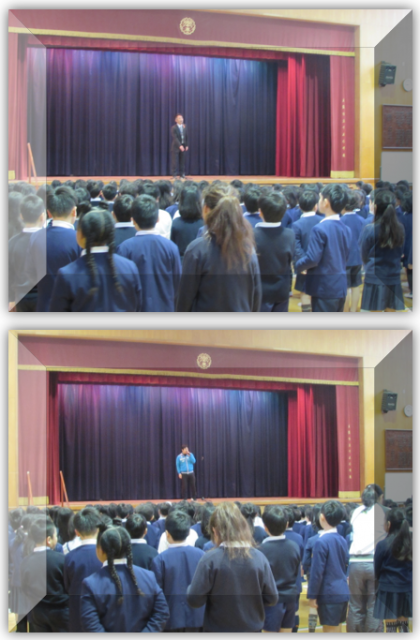 初めに、学校長から「今年2020年は、オリンピックがあり、千本小学校の100周年記念行事も行われます。いろいろなことを体験できる年にしたいですね。」「3学期になりました。1学期からお話している『千本小学校の生活のさしすせそ』ができていますか。『さわやかなあいさつ』はとてもできるようになってきていますね。『しずかなろう下』ができるよう、これからもがんばっていきましょう。」「『そろったくつ箱』ができている人は、学習にも集中できていると思います。ひとりひとり、注意していきましょう。」と、話しました。