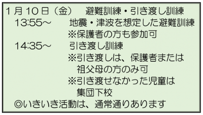 明日1月10日(金)、地震・津波避難訓練および引き渡し訓練を行います。以下の時程で行いますので、どうぞよろしくお願いします。