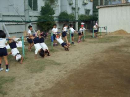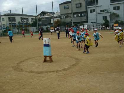 2組は、リレー遊びをしました。障害物の越え方、バトンの渡し方などを、グループで相談しながら取り組みました。