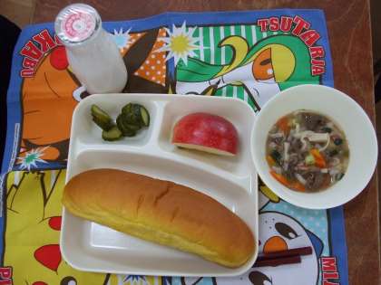 本日の給食の献立をご紹介します。本日の給食は、パンプキンパン、肉うどん、きゅうりの甘酢漬け、りんご、牛乳でした。