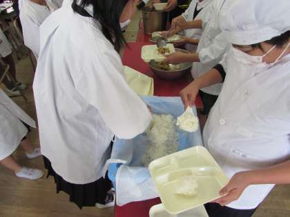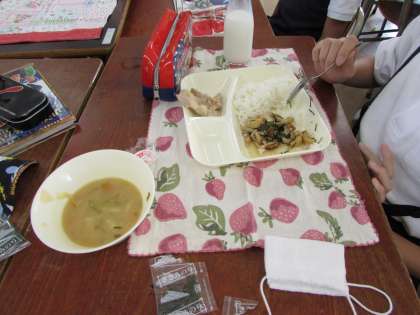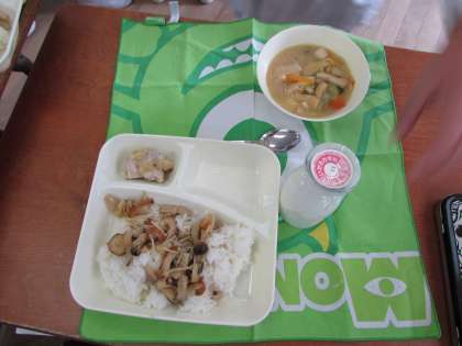 本日の給食の献立をご紹介します。本日の給食は、学校給食献立コンクール優秀賞作品です。テーマは「元気の出るおいしい給食」となっています。本日は、きのこご飯、鶏肉のおろしポン酢がけ、みそ汁、牛乳でした。きのこご飯には、えのきたけ、しめじ、エリンギが使われています。季節を感じる、おいしい給食でした。