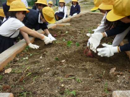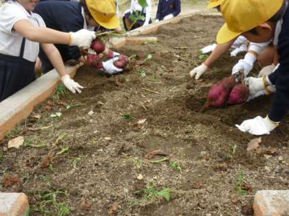 2年生は、今日、学習園でいも掘りをしました。春に苗を植えてから、土の下でどんなに成長をしているだろう、と子どもたちはとっても楽しみにしていました。今日、掘り起こしてみると、大きなおいもがたくさん出てきました。しばらく日陰で干した後、おいもパーティーをします。