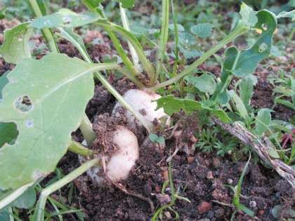 2年生が学習園で育てている天王寺かぶらですが、ずいぶんと育ってきているようです。土の中から、白いかぶの顔がちらちらと見えています。そろそろ収穫できそうです。