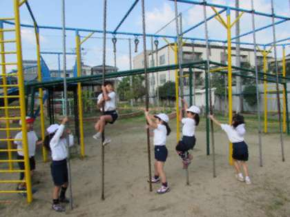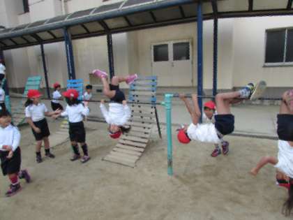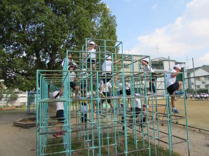 1年生の学習の様子をご紹介します。今日は、運動場で体育の学習をしています。1組は、鉄棒と総合遊具に分かれての活動です。鉄棒では、逆上がりができる子もいます。総合遊具では、ジャングルジムに上ったり、のぼり棒にチャレンジしたりしています。