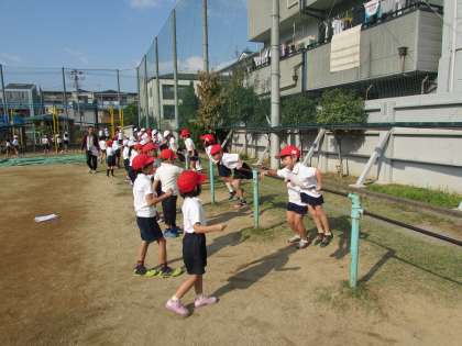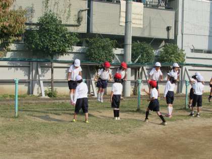 1年2組の体育の学習のようすです。2組は、鉄棒運動に取り組んでいます。「つばめ」の姿勢で鉄棒の上にいる子と、下にいる子が、じゃんけんをしています。5回勝負です。