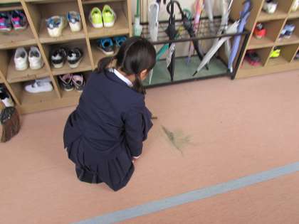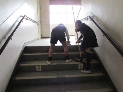 早朝に降った雨は、子どもたちが登校してくるころには止み、朝から子どもたちは元気に運動場で活動をすることができました。しかし、運動場から校舎に戻ってくる際に、靴の泥を十分に落としていない子が多いため、階段や廊下が土だらけになってしまいました。清掃の子どもたちは、そんな土をしっかりと掃き、廊下・階段をきれいにしようと頑張りました。