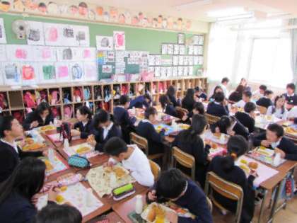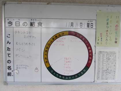 本日の給食放送では、噛み応えのある食べ物について紹介されました。噛み応えのある食べ物には、根菜類、堅い食べ物、弾力のある食べ物などががあります。給食では、根菜類としてたけのこ、れんこん、ゴボウなどが、堅い食べ物としては梨、小魚、りんごなど、弾力のある食べ物としてはイカやタコなどが使われます。1口30回を目安に、しっかり噛んで食べましょう。
