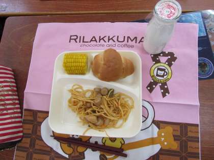 本日の給食の献立をご紹介します。本日の給食は、黒糖パン、チキントマトスパゲティ、蒸しトウモロコシ、牛乳でした。