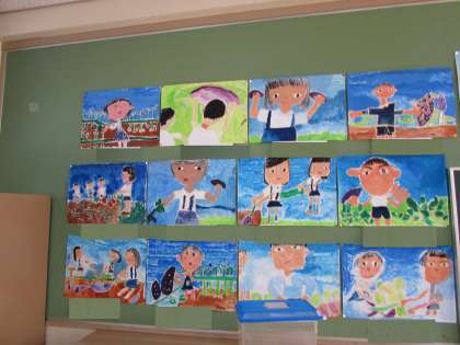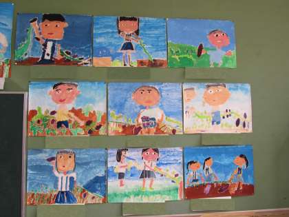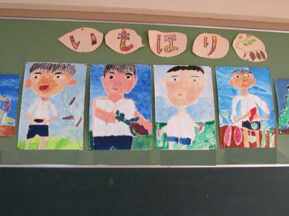 3組の教室には、大きな、おいも掘りの場面を描いた絵が掲示されています。楽しみにして、掘り出したおいもです。子どもたちの笑顔がしっかりと描かれています。