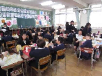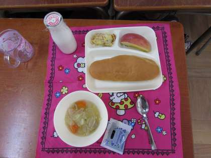 本日の給食の献立をご紹介します。本日の給食は、コッペパン、ブルーベリージャム、ツナポテトオムレツ、スープ、りんご、牛乳でした。