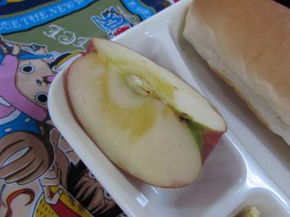 今日のリンゴは、たっぷりと蜜の入った、とっても甘いりんごでした。子どもたちも、「甘い!」と言って、かぶりついていました。