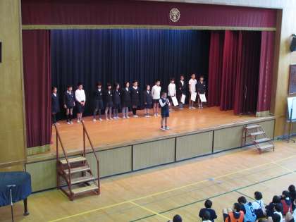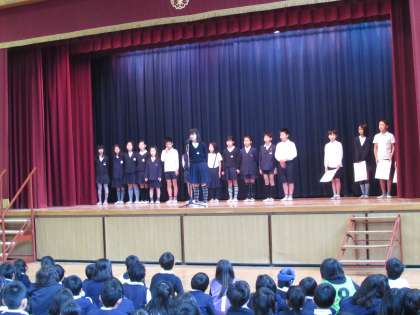 本日の児童集会の様子をご紹介します。本日の集会は、飼育栽培委員会からの発表で、うさぎについてのクイズでした。いろいろな問題が出ましたが、さすがに千本小学校の子どもたちは正答率が高かったです。ただ、最後の問題の「うさぎの歯は、一生伸び続ける。○か、×か。」は、ほとんどの子が間違ってしまい、「正解は、○です。」と発表されると、「ええっ。」という声があがりました。