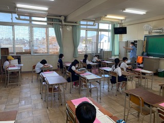 新学期初めての登校日、最初は少し緊張気味の顔をのぞかせていましたが、久しぶりに元気な声と笑顔が戻ってきました。コロナウイルス感染予防の対策を取りながら、各教室では担任紹介や課題の受け渡し、お手紙の配布など、限られた時間を有意義に過ごしていました。(4年生の様子)