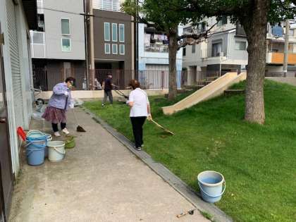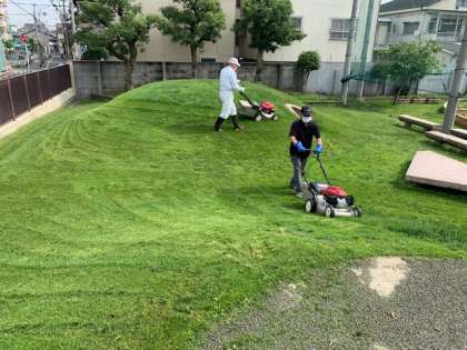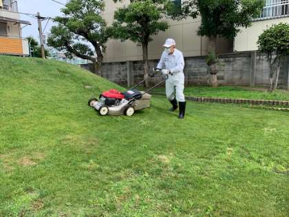 芝生が勢いよく伸びるので、定期的にお手入れをしていただいています。今日も朝から蒸し暑い中ではありましたが、地域の皆さんに芝生のお手入れをしていただきました。平坦なではなく小山になっているところなど、芝を機械で刈るのも一苦労です。でも、慣れた様子でとてもきれいに仕上げていただきました。本当にいつもありがとうございます。