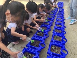 アサガオの種植えをしてから、1週間がたちました。子どもたちは、毎日気持ちを込めて水やりを頑張っています。今日もやさしく水やりをしました。