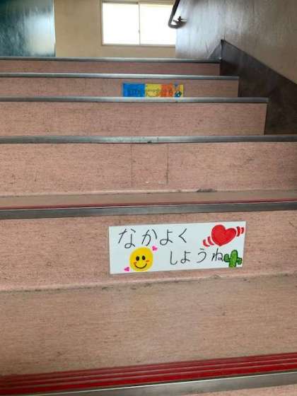 そんな思いを持っている千本小学校の下級生のために、6年生が応援メッセージをカードに書き、階段に貼りました。