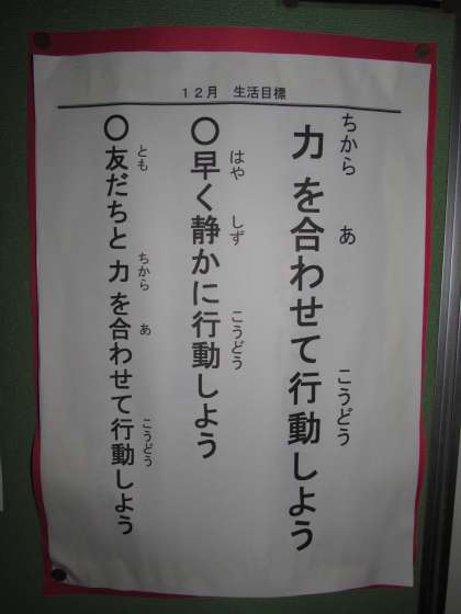 12月になり、生活のめあてが変わりました。12月の生活のめあては、「力を合わせて行動しよう」です。具体的な目標は、「速く静かに行動しよう」「友だちと力を合わせて行動しよう」です。子どもたちの頑張りに、期待しています。