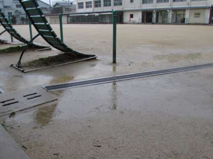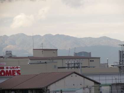 今日は朝早くから雨が降り、運動場であそぶことができなくて(画像上)、子どもたちもつまらなそうにしていました。給食の後、そうじをしていると、子どもが「先生、山がすごくきれい!」と、教えてくれました。窓から北西の方角を見ると、雲の切れ間から射す太陽の光に照らされて、山々が見えました(画像下)。方角からすると、神戸方面の山でしょうか、今まで見たこともないような、きれいな景色でした。