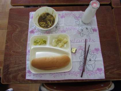 本日の給食の献立をご紹介します。本日の給食の献立は、コッペパン、バター、カレーうどん、やきじゃが、白菜の甘酢和え、牛乳でした。