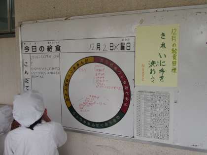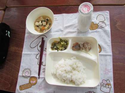 本日の給食の献立をご紹介します。本日の給食は、ご飯、鶏肉のゆず塩焼き、田辺大根のみそ汁、田辺大根葉と白菜の煮びたしでした。