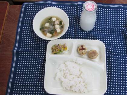本日の給食の献立をご紹介します。本日の給食は、ご飯、揚げシューマイ、とうふのスープ、ツナとチンゲンサイの炒め物、牛乳でした。