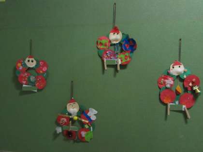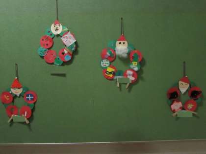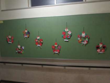 3年生の図画工作の作品です。3年生は、リースを作りました。飾りつけを工夫して、世界に一つだけのリースを作りました。