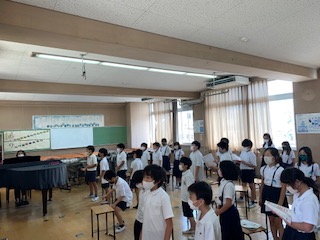 やさしい歌声と、素敵なピアノ伴奏にひかれて音楽室へ行ってみました。4年生児童が「花束をあなたに」を気持ちよく歌っていました。とても幸せな気持ちになりました。