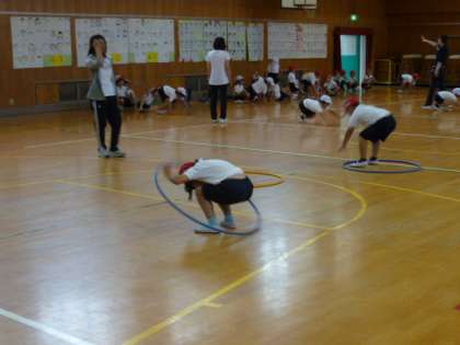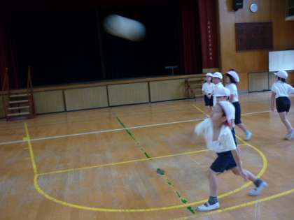講堂で、おにごっこやフラフープ、ドッジボールをしました。