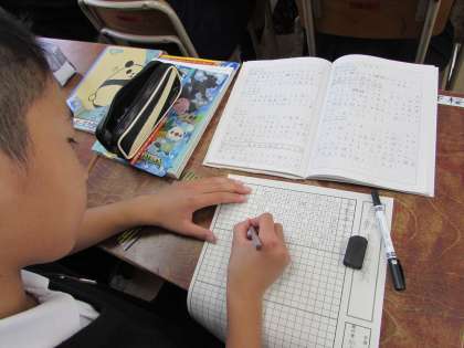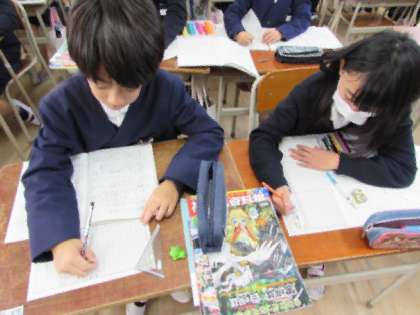 5年生の学習の様子です。1組は、国語の学習「表やグラフを引用しよう」で、文章の推敲をする学習に取り組んでいます。(画像上)