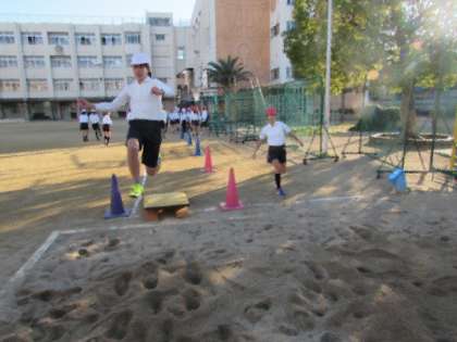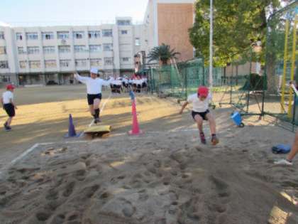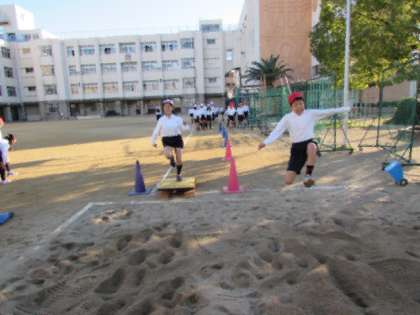 5年生、6年生は、体育で走り幅跳びを行っています。踏み切る位置にロイター板(踏み切り板)も置き、「前に跳ぶ」ではなく「高く跳ぶ」ということを意識するようにして、練習を行っています。