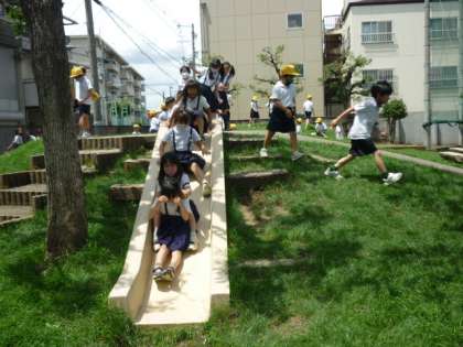 7月16日(木) お昼休みに元気に外で遊びました。芝生ですべり台をしました。