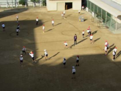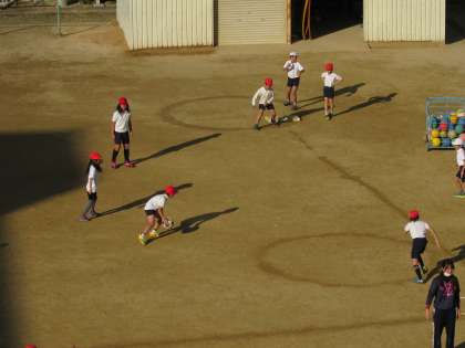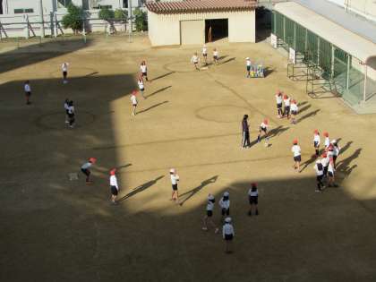 画像は、4年2組が体育でキックベースボールをしているところです。