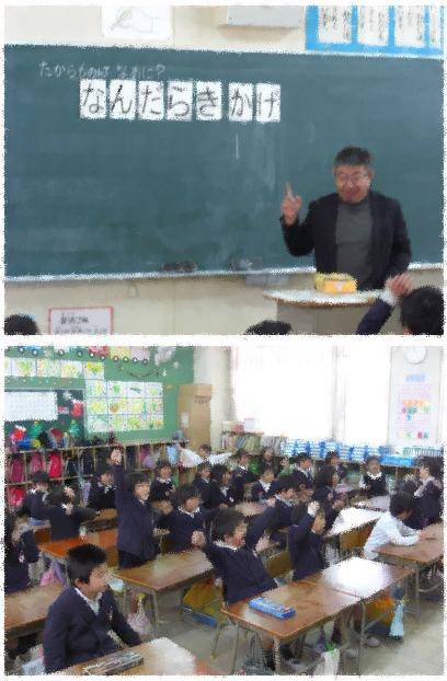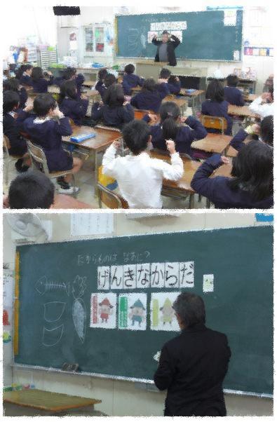 本日の2・3時間目、1年生の各クラスで、食育を行いました。天下茶屋小学校の栄養教諭の方に来ていただき、今日は「あか・みどり・きいろ」の食べ物についての学習をしました。食べ物には「あか」「き」「みどり」の仲間があること、強く、元気な体をつくるためには、それらをバランスよく食べることが大切である、と教わりました。おうちの人に教えることが宿題になっています。ご家庭でも、お子さんと話題にしてみてください。