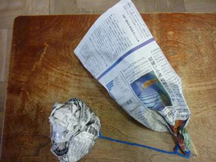 新聞紙と毛糸を使ってけん玉を作りました。