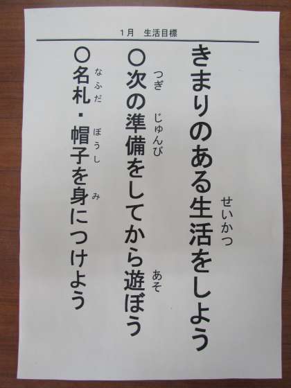 1月の生活目標です。1月の生活目標は、「きまりのある生活をしよう」です。具体目標は、