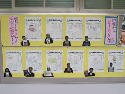 職員室前の廊下の掲示板に、図書委員会の子どもたちの「おすすめの本」が掲示してあります。5年生、6年生の図書委員会の子どもが、読んで面白い、楽しいと思った本です。学校へお越しの際に、ぜひご覧ください。