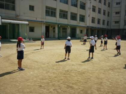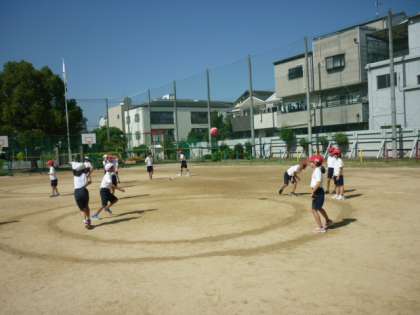 運動場でボールゲームをしました。元気いっぱい活動しました。
