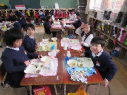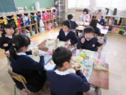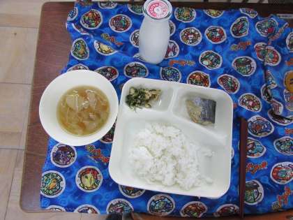 本日の給食の献立をご紹介します。本日の給食は、ご飯、さごしのしょうゆだれかけ、すまし汁、水菜の煮びたし、牛乳でした。
