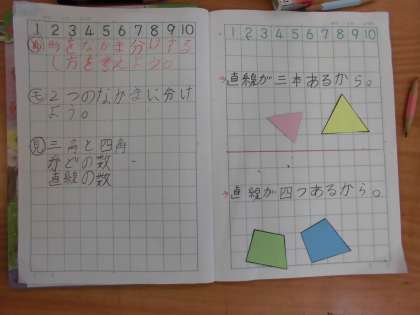 算数で三角形、四角形の学習をしました。形を2つのなかまに分け、分けた理由を考えました。形はかこんでいる直線の数によって、なかま分けすることができることに気づくことができました。