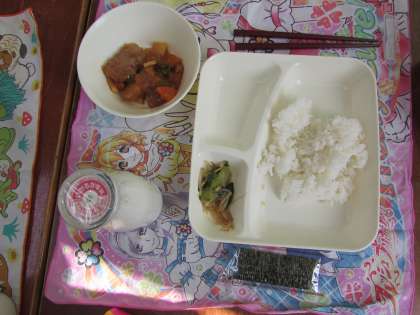 本日の給食の献立をご紹介します。本日の給食は、ご飯、酢豚、中華和え、焼き海苔、牛乳でした。
