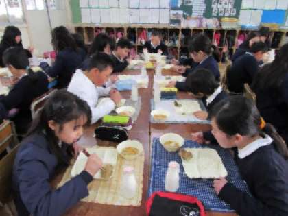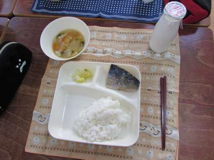 本日の給食の献立をご紹介します。本日の給食は、ご飯、サバの味噌煮、のっぺい汁、白菜の甘酢漬け、牛乳でした。